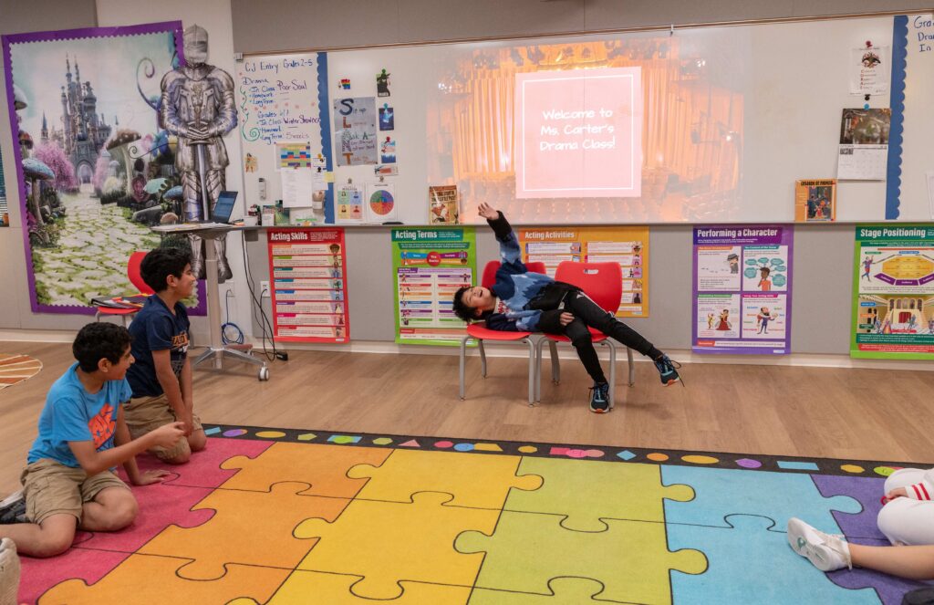 Drama classes are offered across primary and middle school grades, giving students multiple opportunities to grow on stage and beyond the classroom.