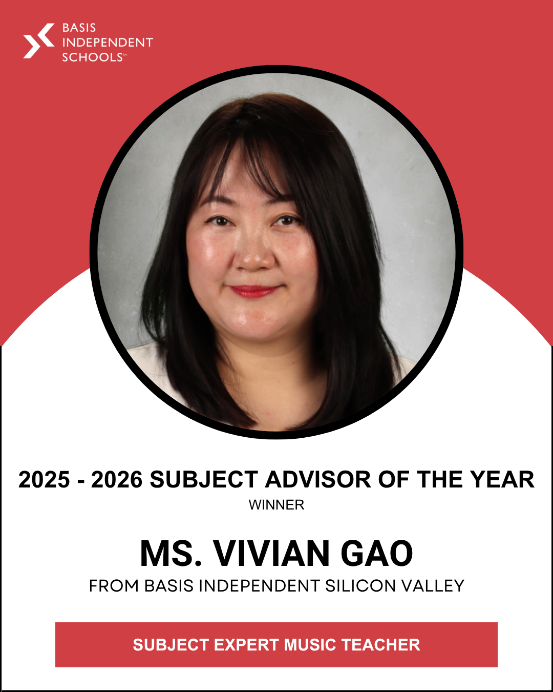 We extend heartfelt congratulations to our 2025 – 2026 Subject Advisor (SAD) of the Year, Ms. Vivian Gao, from BASIS Independent Silicon Valley Lower! Ms. Gao is the Subject Advisor for Music in PreK – Grade 5.