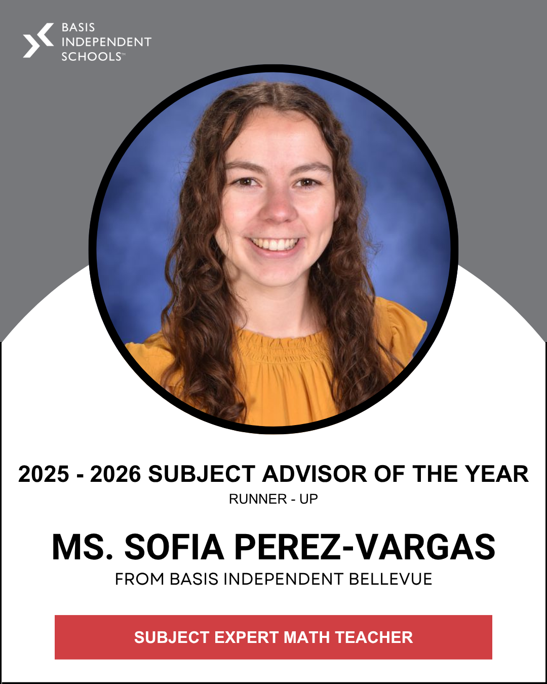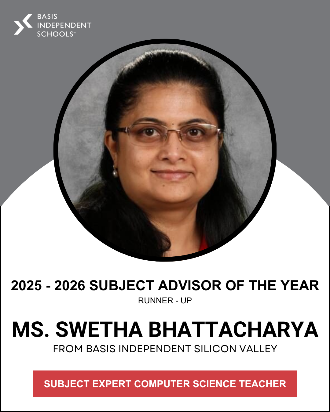 Congratulations, too, to our runners-up, Ms. Swetha Bhattacharya (Computer Science) from BASIS Independent Silicon Valley Upper, and Ms. Sofia Perez-Vargas (Pre-Algebra and Algebra & Geometry I), from BASIS Independent Bellevue!