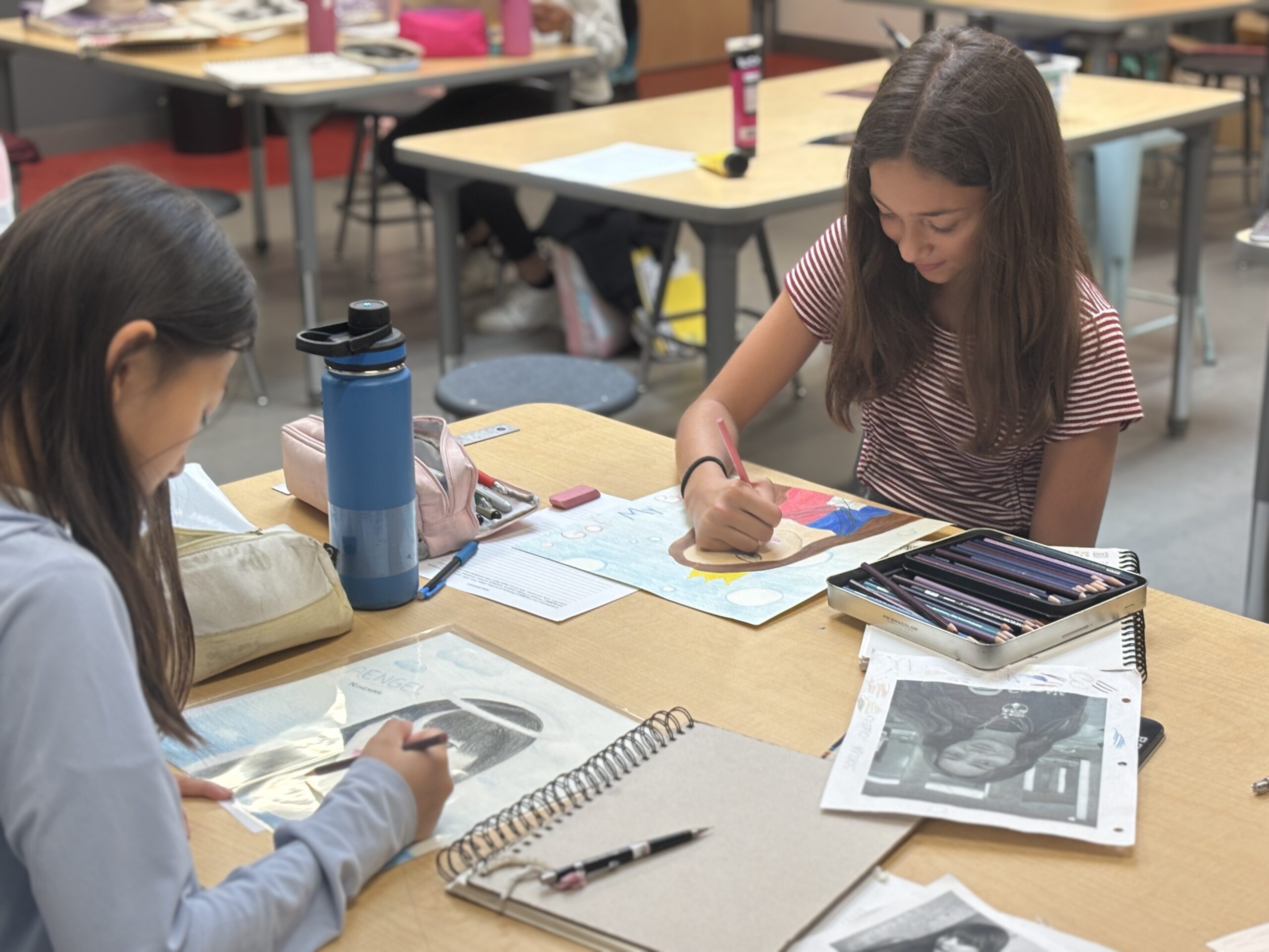 Students are completing their Album Cover Portraits, creating transformative works based on reference photos of subjects meaningful to them. Uma’s portrait features her older sister.