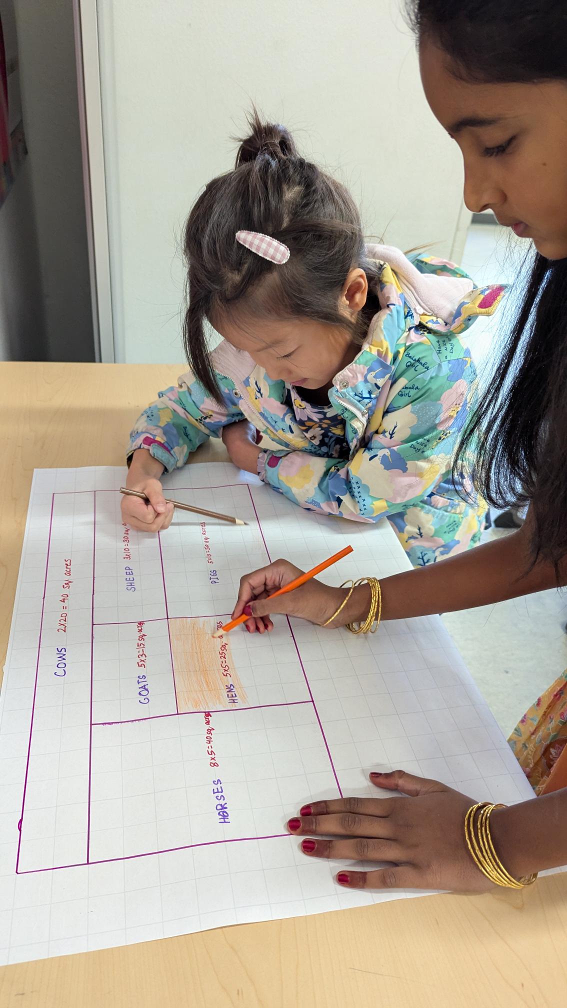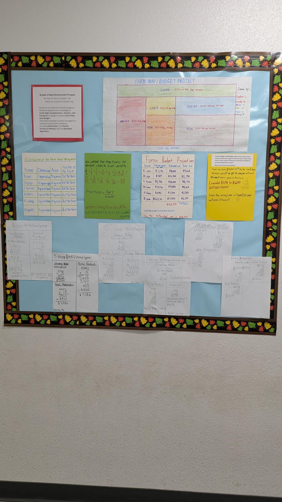 “The students and I are having a wonderful time creating a Farm Map and Budget while applying multi-digit multiplication using estimation, partial product method, standard algorithm, and fractions,” Ms. Bhora explains. “So far, the students have designed a farm map featuring six different farm animals. They calculated how much area each animal will need, the fraction of the farm’s total area per animal, and added the fractions to double-check their work. They have now started working on the budgeting portion. I gave them the annual cost of raising an animal. They need to calculate the total cost per animal and estimate whether a given amount will be enough to run the farm each year. The kids and I are having a lot of fun doing this enrichment project.”