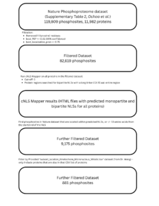 After meeting with my mentor with the flowchart in hand, he made some comments on how I can revise the workflow. While in the past weeks, I implemented this workflow as a proof-of-concept with preliminary parameters, he suggested that I make certain modifications: for example, including tyrosine phosphosite residues, lowering the threshold for best localization probability of phosphosites, and decreasing the cut-off score for NLSs to 4.0. So, this week, after modularizing and organizing my Python functions, as well as making them more interpretable with commenting (I often overlook this important aspect of programming…), I re-ran the workflow from the beginning: from filtering the Nature dataset to running cNLS mapper to parsing HTML results to finding SNPs. As my dataset now has 20,000+ phosphosites (located within 4,500+ genes), it is taking a long time to retrieve genomic and SNPs data (the code is still running). I tried parallelizing the code – sending multiple web requests at once using threads – but it is still slow, and I am experiencing some challenges with this, as the server keeps crashing. Hopefully, I will be able to share the results early next week.