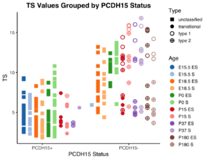 Not much has changed about the PCDH15 cell count graph. I still want to include it because it will be an important graph on my final poster. For the overall structure of the PCDH15 graphs, I will do the TS graph, the TS graph with only the ES cells, the TS graph with only S cells, and then the cell count graph. I’m still figuring out my FSCN2 data and graphs but it will likely include something similar. However, the FSCN2 data is complicated by the fact that we included some data sets that track prenatally and postnatally added cells which will need to be considered in the analysis.