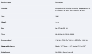 I’m currently working on the analysis part of the individual case studies, and the Python program for the charts is in progress. (Refer to last week’s blog if you’re not sure what I’m talking about). For the record, here are the variables that I’m going to be looking at the most for the case studies, as shown by my data requests from the Copernicus Climate Data Store for Allison 2001: