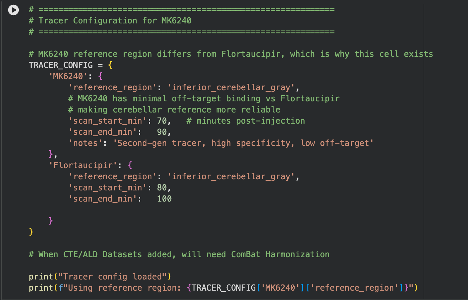 As for the actual flow of the pipeline, it is made up of 5 main cells. The first cell handles imports and installs for the actual software we use(OpenNeuro Downloader, NumPy, etc). The second cell involves a tracer configuration/converter, as some datasets use the MK6240 tracer, which needs to be standardized back to the most common tracer(Flortaucipir). This is shown below.