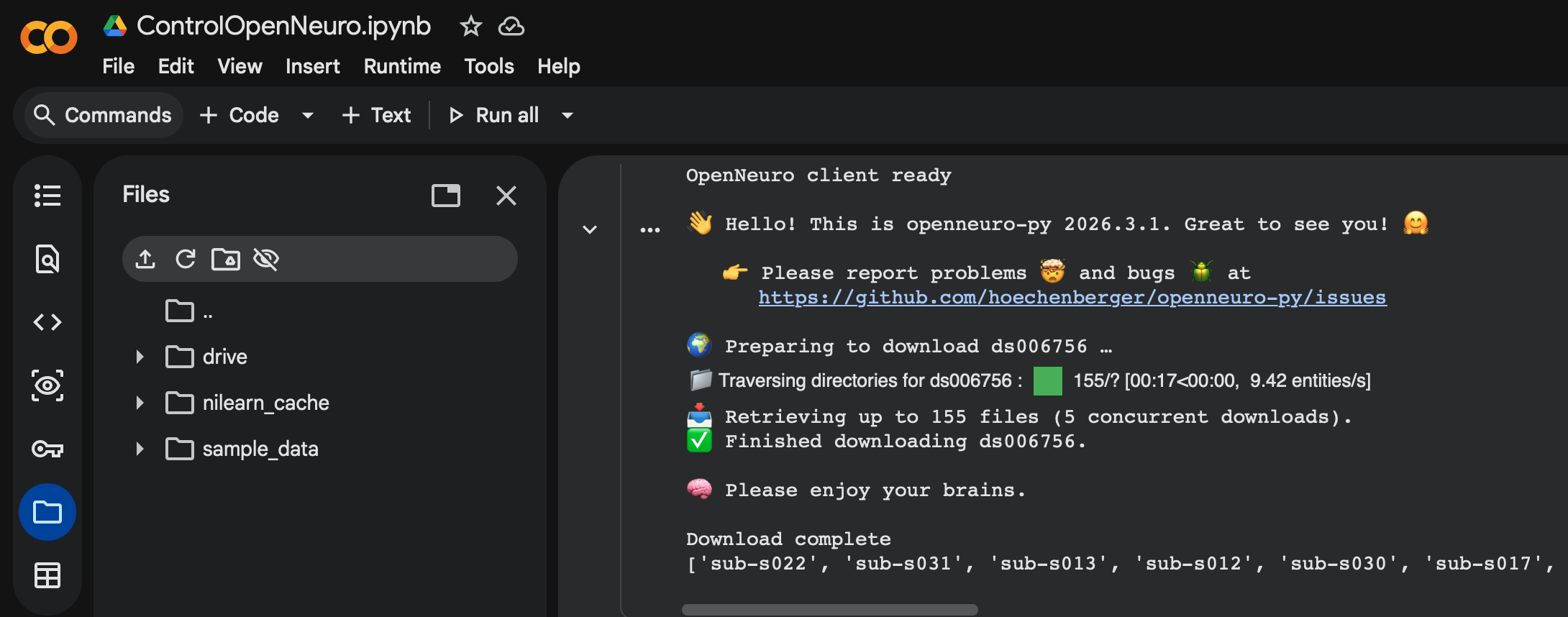So how exactly did I establish the groundwork for this pipeline? The control dataset I used for the base was ds006756 from OpenNeuro, which consists of 33 patients with normal, young individuals with healthy tau distribution across their brain. This served as a great control, and the fact that it was from OpenNeuro helped even further as they have a specific API within Google Colab that allows my pipeline to be directly integrated with their datasets. This means that no manual download is needed, and that datasets can be downloaded and processed simply by coding a cell using the API. This is great as it allows for new datasets to be processed and integrated seamlessly within the entire ML model, often needing only one more cell of code to download and process it.(Shown below)