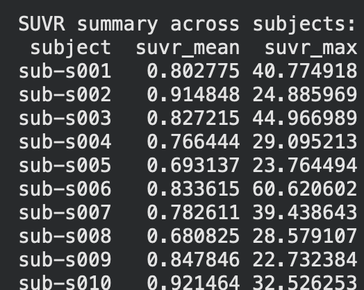 The biggest finding, which is also very crucial to this project, was the unevenness of tau concentration within healthy individuals. This is crucial for the project as now we have a baseline to compare datasets of unhealthy tau buildup, and truly note any tauopathic disease traits that might be present within the test scans as compared to general unevenness. In the next few weeks, I will continue to expand this pipeline into a multi-dataset, fully-functioning, and accurate ML model. Until next time!