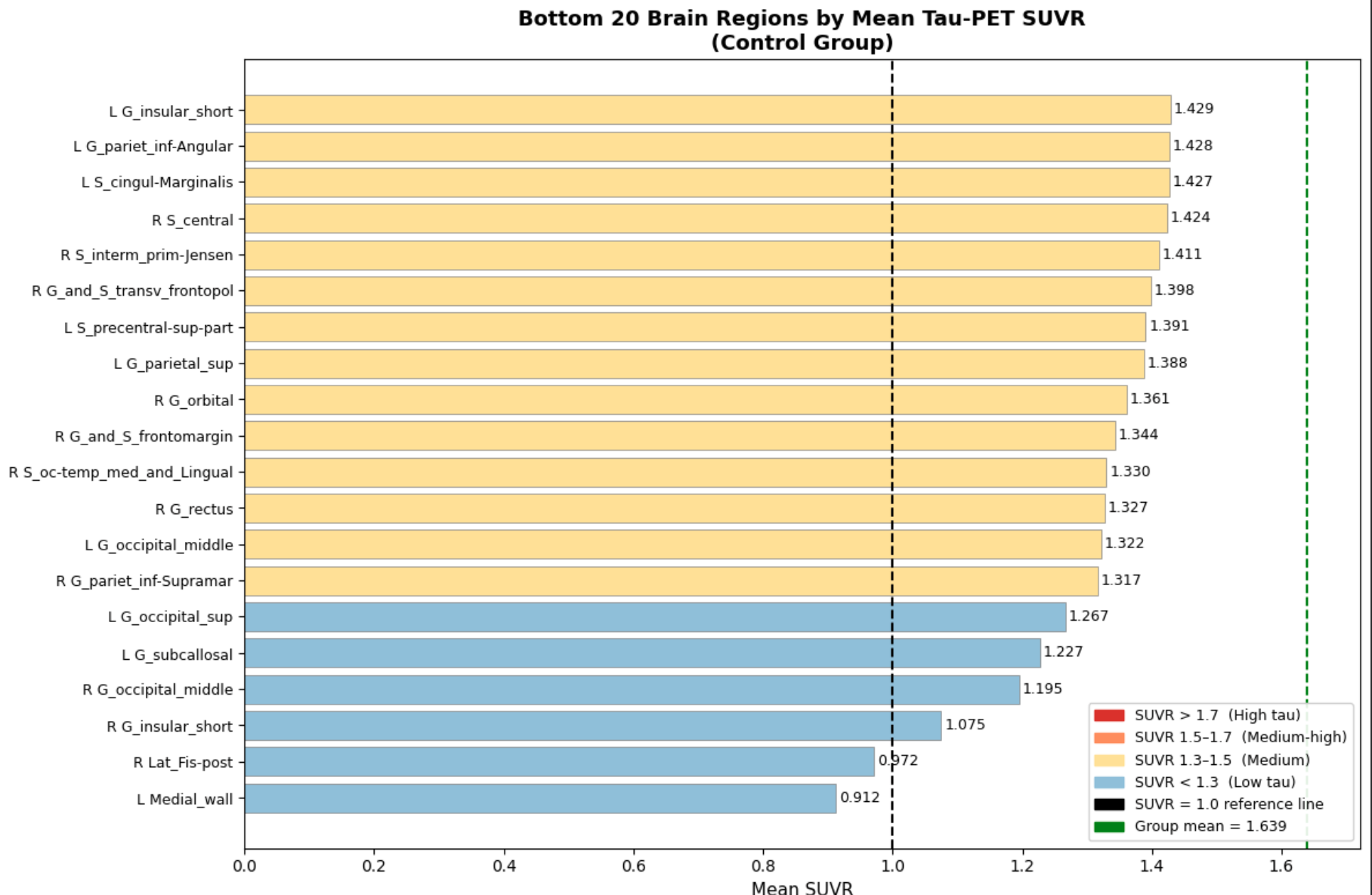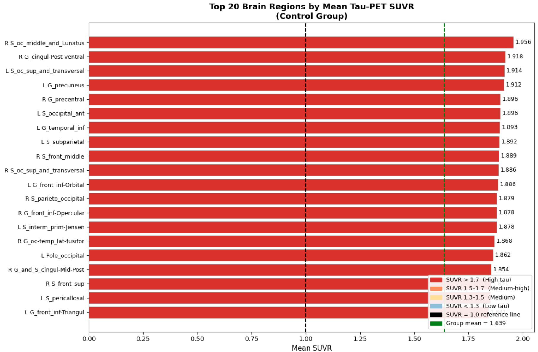 Hi all! This week, I finally finished gathering and finalizing datasets and began on making the processing pipeline for the different datasets that I will be using to both train and test the model on. Specifically, I was able to finish the foundation of the control dataset processing pipeline and generate graphs and statistics to compare the other two datasets(ALD and CTE) to. The specific statistics used here were SUVR(Standardized Uptake Value Ratio), which, put simply, means the concentration of tau protein within a certain area. The results are as follows below on the left(first ten subjects only).
