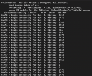 Immediately after running, TOPAS will output a lot of the information about the setup, including copyright information for TOPAS, beam parameters, etc, and also effects like Coulomb scattering, which I won’t include here for sake of saving space.
