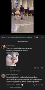 A video with on-screen text that reads “american ballet dancers >> russian ballet dancers” stirred controversy amongst commenters. Surprisingly, users were able to reach some sort of consensus: Russian technique is unrivaled. The discourse seems to stem from individual interpretation of artistry. Take a look at some of the top comments.