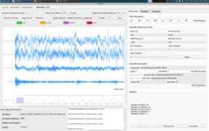 After finding and fixing all four of these errors, everything eventually worked. I loaded the test file, ran detection (23 HFOs found), and classification completed successfully, sorting them into 19 artifacts, 4 real HFOs, 1 spkHFO (an HFO occurring alongside a spike in brain activity), and 3 eHFOs (a specific subtype of HFO). The GUI displayed “Classification finished!” and the EEG waveforms to the left rendered fully and were ready to annotate, as shown in the image below.