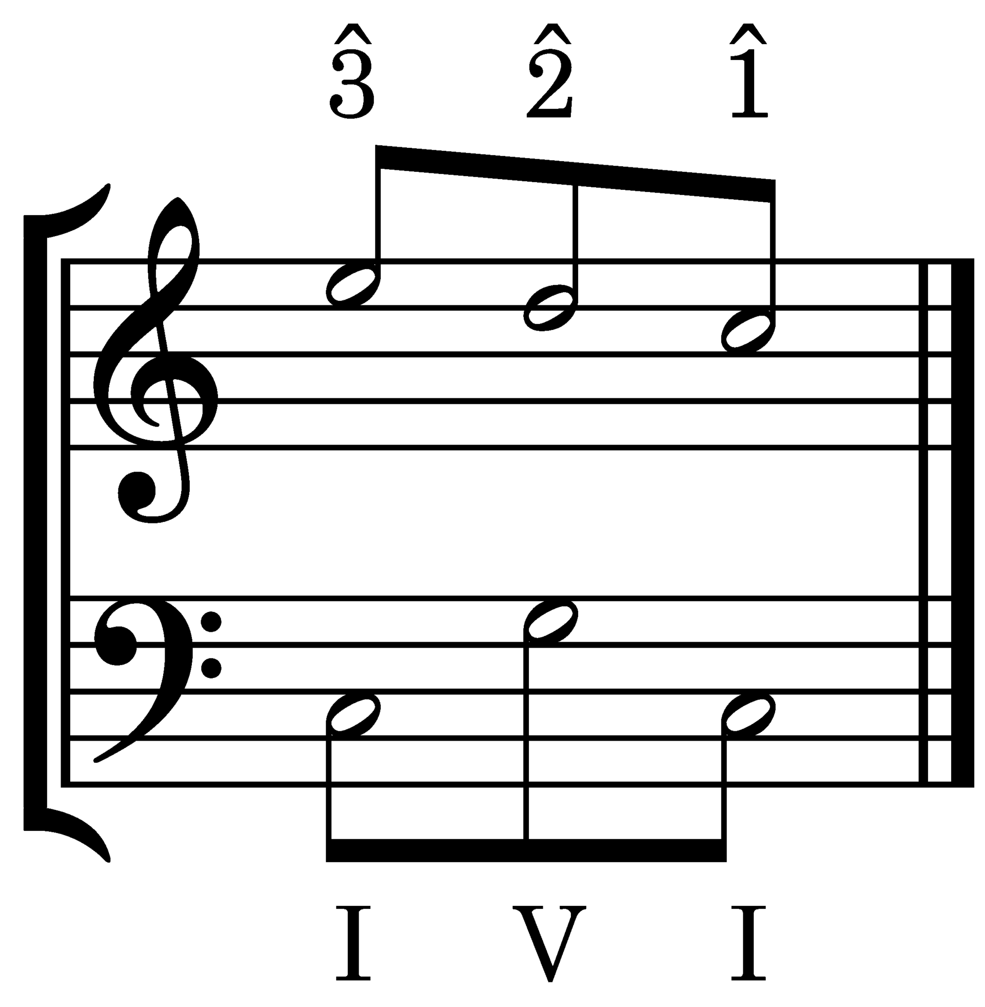 As Fig. 1 indicates, the structure of the Ursatz consists of 2 parts: 1) the Urlinie (the fundamental, main melodic line) must descend from one of the three possible Kopftones (head tones, or primary/initial tones)—3, 5, and 8—to 1; and 2) the Bassbrechung (the bassline) of the structure I-V-I should accompany the Urlinie.