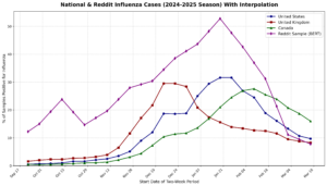 To plot and make comparisons between my findings and national reports, I first collected flu rates reported every two weeks from national databases from September 29, 2024 to March 29, 2025 to cover the current flu season [2], [3], [4]. I made sure the start date of each two-week period aligned with the dates of my data, and plotted them together on a line graph: