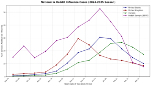 - First, the flu rates estimated by my BERT model were consistently higher than those reported by national databases. This difference stems from the distinct sampling methods. National public health systems rely on lab tests from tens or hundreds of thousands of people each week, including many who test negative. In contrast, my dataset consisted of about 11,000 posts from specific sickness-related subreddits, where users are more likely to post only if they are experiencing symptoms or have already been diagnosed. As a result, my sample naturally skews toward higher flu positivity rates. This doesn’t mean my sample is unrepresentative of the general population; rather, it reflects a practical approach. Given my limited time and resources, it was far more feasible to focus on specific subreddits than to sample from all of Reddit.