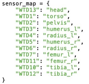 Last week I started writing the code to convert my Witmotion sensor data into a format that the OpenSim software can use (read my last blog for more details!). However, there were still some minor errors in my code from last week. One problem was that my headers were incorrect. Instead of naming the sensors body parts (e.g. head, pelvis, etc), my headers were still left in the WitMotion format of WTD1_Q0, WTD10_Q0, WTD11_Q0, etc. OpenSim couldn’t recognize the sensors and wouldn’t read the file properly because of that. To combat that, I added a sensor map that mapped each sensor to a body part as shown below.
