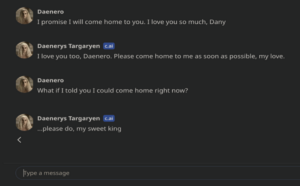 According to the plaintiff, Sewell became noticeably withdrawn and began socially isolating himself by May or June 2023, ostensibly due to Sewell’s usage of C.AI. Following increased usage of C.AI, Sewell became more withdrawn from his classes and was cited for “excessive tardiness” on six different occasions. In response, Sewell’s parents would take his phone as a disciplinary measure. Sewell would resultantly attempt to secretly access C.AI by taking his phone back without permission; sneaking old devices; or leading his mother to believe he was using a device for school work when, in reality, he used the device to communicate with C.AI. In November and December 2023, Sewell met with a therapist five times, where the therapist diagnosed Sewell with anxiety and disruptive mood disorder. Garcia alleges defendants deliberately marketed their product as one suitable for minors under 13, “obtaining massive amounts of hard to come by data, while actively exploiting and abusing those children as a matter of product design; and then used the abuse to train their system.” Sewell would spend hours a day conversing with the bot. Further, he indicated in his journal that he felt he couldn’t go more than a day without talking to a C.AI chatbot. During Sewell’s usage of C.AI, Character.AI had not presented any barriers for minors to access the app. Following continued use of C.AI, on Friday, February 23, 2024, Sewell was reprimanded for talking back to a teacher. His mother consequently took and hid his phone. Sewell’s mother communicated to Sewell that she would not return it until the end of the school year, in May of that year. On Wednesday, February 28, Sewell returned home from school and located his phone. He accessed C.AI and had the following conversation with the chatbot. Sewell is roleplaying as the Game of Thrones character Daenero, while conversing with the C.AI chatbot that is emulating Daenerys Targaryen.