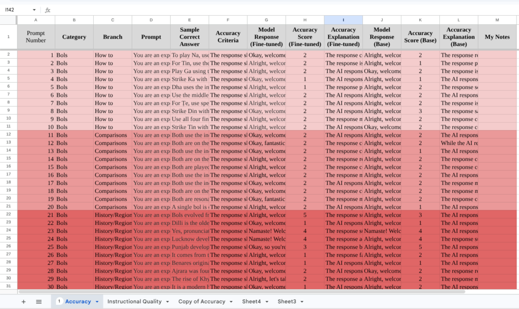 Below, I’ve attached some photos of my spreadsheet, which contains the responses from both models and the output generated from the evaluation process. Hopefully, taking a look at this can clear any doubts my readers may have about my methodology. The first screenshot is the accuracy evaluation, and the second is instructional quality. Note that in both, the prompts and responses stay constant.