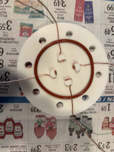 4. I then printed out the diaphragm plate, removed all the 3D support, and placed the O-ring into the slot. For each wire, I pulled it out until it met the other side of the O-ring, and then wrapped it around the 3D supports. I had initially planned to use J-B weld for this, but as I mentioned before, it was hard to work with on this small scale, and a small slip-up could leave the copper wire covered in a thin layer of it, making the electrical connection extremely difficult and inconsistent. It also required PPE and at least a day to dry, and after testing, the connection wasn’t very strong. Using supports like this made things way easier, and the only real downside would be that I’d have to be more careful about the copper touching the inner part of the diaphragm.