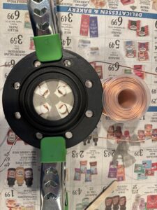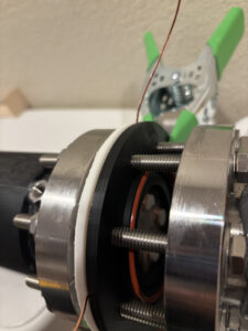 7. Final installation just consists of unbolting, taking out the previous diaphragm, adding the other two O-rings, and rebolting the new diaphragm in. I also wrapped the copper wire around the connection anchor on the driven tube, and connected them to the positive and negative wires from the control room. As a quick point of safety, the flange is also wrapped in electrical tape to ensure none of the bare metal wires make contact with it, and I made sure my power supply had short-circuit protection.