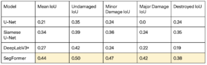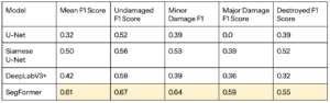 Here it’s much more predictable. The SegFormer outperforms both U-Nets and DeepLabV3+ very noticeably, likely because the SegFormer’s transformer architecture allows it to capture more context, learning features that are less obvious. Also note that DeepLabV3+ performs slightly worse than Siamese U-Net, but better than normal U-Net. This is likely evidence to show that the Siamese architecture to incorporate pre-disaster data really does help the model learn features better.