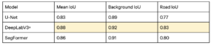 All three models perform very well on road detection, all reaching well above 0.8 IoU and F1 score. Even though SegFormer is the most advanced architecture, surprisingly DeepLabV3+ is the most successful model. Since all the models have metrics very close to each other, only differing at the hundredth point, it could likely be due to random differences in model training, or not optimizing all the parameters for each model.