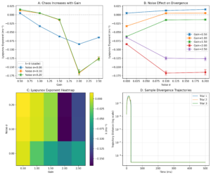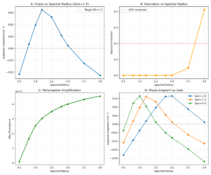 Now, this is EXACTLY what I’ve been waiting for. It’s honestly so satisfying looking at this. Graph A shows that my suspicions were right. There is an ideal spectral radius that results in the greatest Lyapunov exponent. Both too low and too high results in attraction. Graph B adds to this, showing that saturation certainly does occur at higher spectral radius values. Graph C shows the diminishing slope of divergence per spectral radii which makes sense as well. This is really really exciting for me, as this is the behavior that I have seen in past papers. For example, “Lyapunov spectra of chaotic recurrent neural networks” by Engelken et al posits that while coupling strength between neurons increases, mass saturation occurs, bending the Lyapunov spectrum downwards.